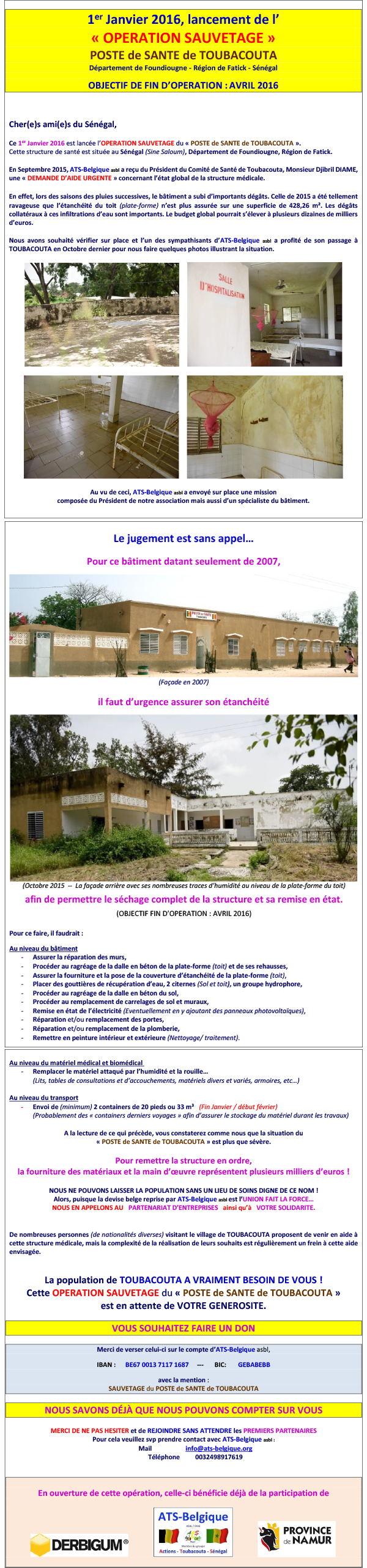 Ce 1er Janvier 2016 est lancée l’OPERATION SAUVETAGE du « POSTE de SANTE de TOUBACOUTA ». Cette structure de santé est située au Sénégal (Sine Saloum), Département de Foundiougne, Région de Fatick.